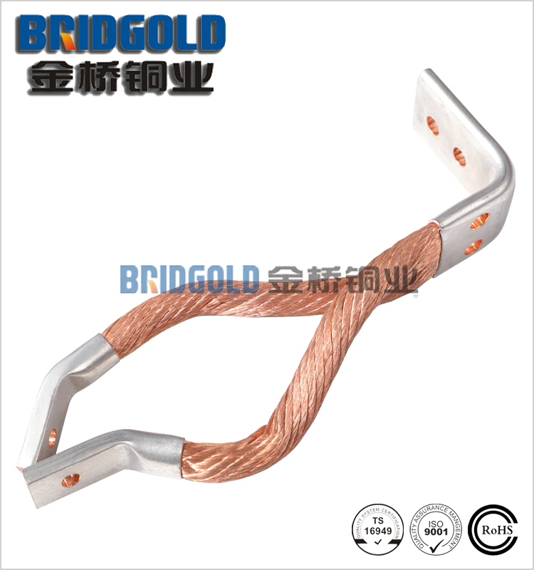 金橋大電流銅絞線軟連接也叫銅絞線導電帶、銅絞線伸縮節(jié)等,采用T2無氧紫銅銅桿,經(jīng)多道拉絲工藝拉制成絲,表面裸銅或可鍍錫、鍍銀,再進行絞合成線,兩端壓鍍錫銅管或直接焊熔制成一體化軟連接,或兩端壓線而成。