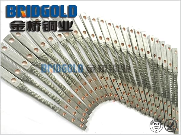 - 銅編織線軟連接采用T2無(wú)氧銅桿,經(jīng)多道擠拉工藝?yán)瞥山z,表面裸銅或鍍錫或鍍銀,再進(jìn)行編織成線,兩端壓鍍錫銅管或純銅管而成。